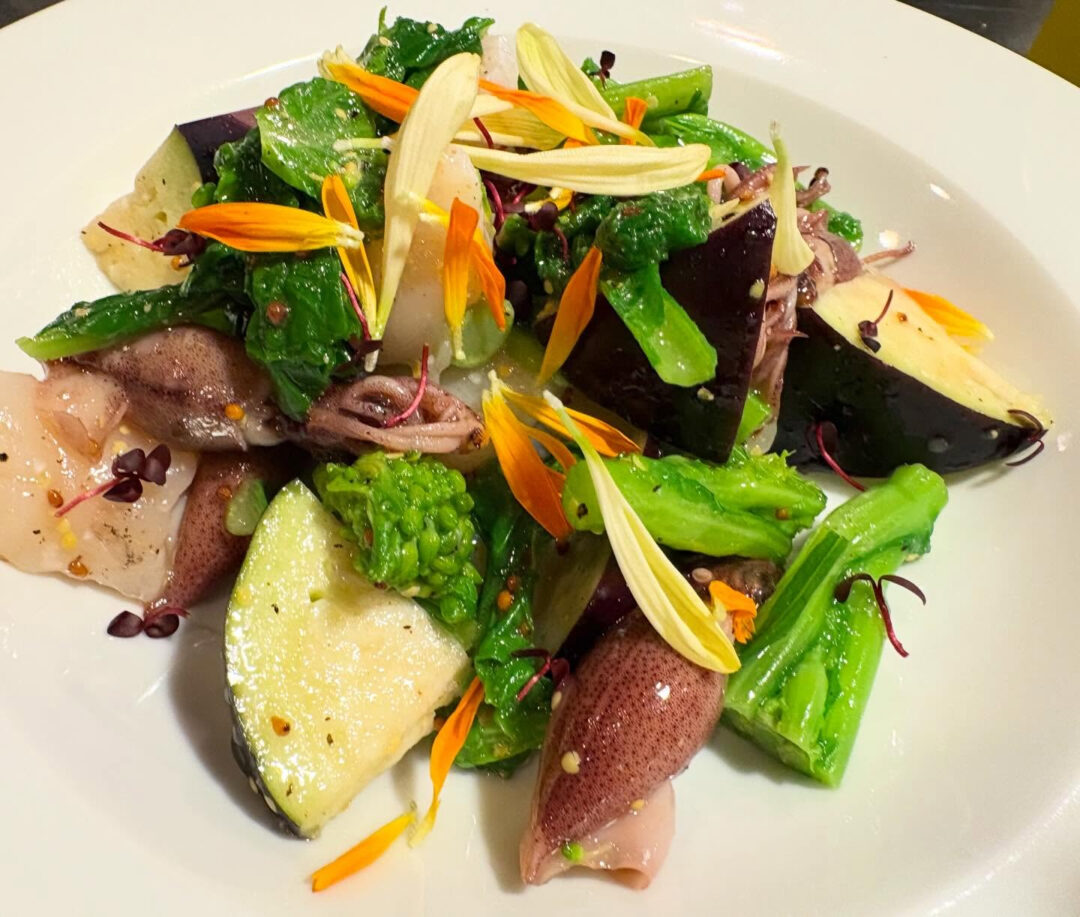 『 富山県のホタルイカと北海道生ホタテと菜の花と水茄子などのマリネ 』